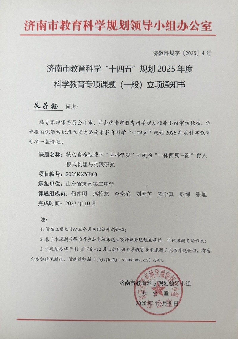 近日,济南市教育科学研究院正式公示济南市教育科学“十四五”规划2025年度科学教育专项课题拟立项名单,济南二中教导处副主任朱子钰主持的《核心素养视域下“大科学观”引领的“一体两翼三融”育人模式构建与实践研究》课题成功入选。这一成果不仅标志着学校在科学教育领域的研究与实践获得市级权威认可,更为学校深化科学教育改革、提升育人质量注入了强劲动力。
