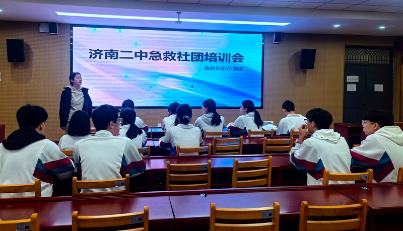 11月5日,济南二中急救社团的首次培训会热闹开场,社团成员们围着讲台、凑着模拟教具,全神贯注地跟着老师学 “救命本事”,一场干货满满的急救学习之旅就此展开。