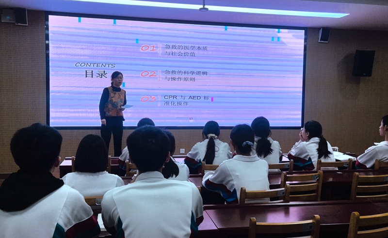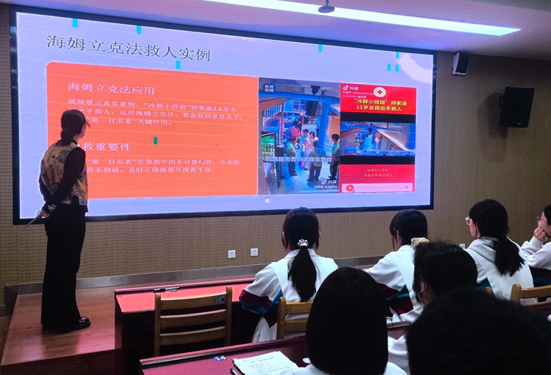 一开场,校医务室的胡晶老师就用校园里可能遇到的小意外、生活里真实的急救案例当 “引子”,一下子抓住了大家的注意力。“急救就抢黄金四分钟,早一秒行动,就多一分希望!” 胡老师的话让同学们瞬间绷紧了神经,也明白了急救的紧迫性。随后,她点开教学视频,AED 设备的每一步操作都看得清清楚楚 —— 从怎么打开机器、电极片贴在胸口哪个位置,到操作时不能碰患者的注意事项,胡老师边看边讲解,还时不时停下来问 “看明白了吗?”,确保每个人都能跟上节奏。到了心肺复苏教学环节,胡老师更是手把手教:“按压深度至少 5 厘米,频率要快,每分钟 100 到 120 次,就像跟着快节奏音乐打节拍!” 她还纠正了几个同学按压位置偏、力度不够的问题,直到大家的动作越来越标准。