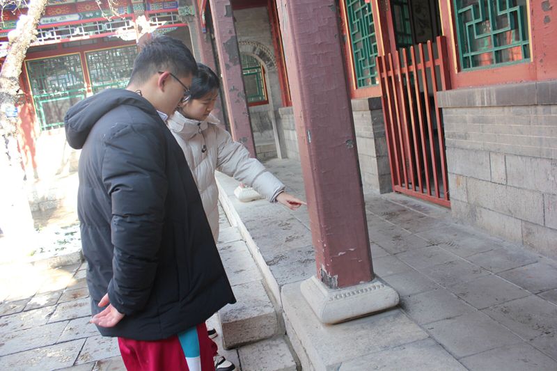 学生们依据手册规范,细致观察建筑的形制、结构、装饰细节,运用课堂所学的古建筑知识进行辨识与记录,并对比文献资料,验证和丰富认知。部分学生尝试运用前期设计的访谈提纲,与景区工作人员、老济南居民及游客进行交流,了解建筑保护现状、日常管理细节以及公众对这些历史空间的感知与期待。同学们特别关注了建筑的维护状况、修缮痕迹、与周边环境的协调性,以及文化阐释与公众教育设施的完善程度,结合前期研究中发现的共性问题,进行有针对性的考察。