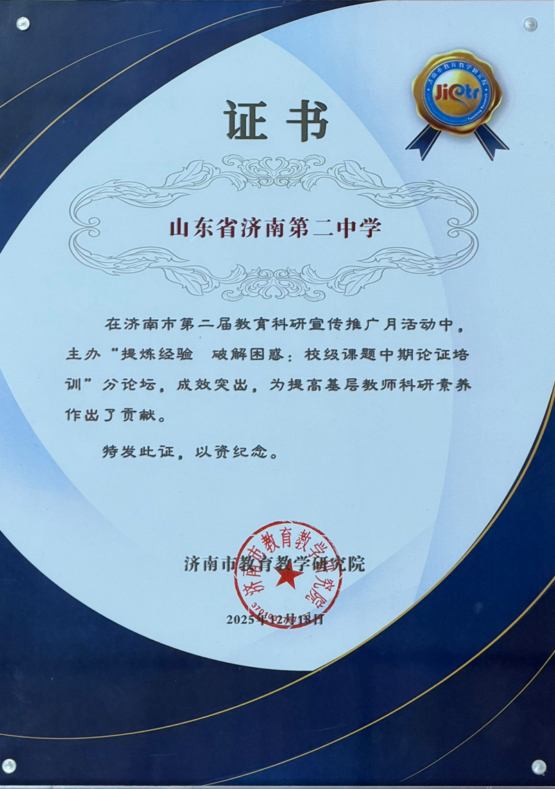 近日,在济南市第二届教育科研宣传推广月活动中,山东省济南第二中学主办的“提炼经验破解困惑:校级课题中期论证培训”分论坛成效突出,被济南市教育教学研究院授予表扬证书,学校因在提升基层教师科研素养方面的重要贡献获官方认可。