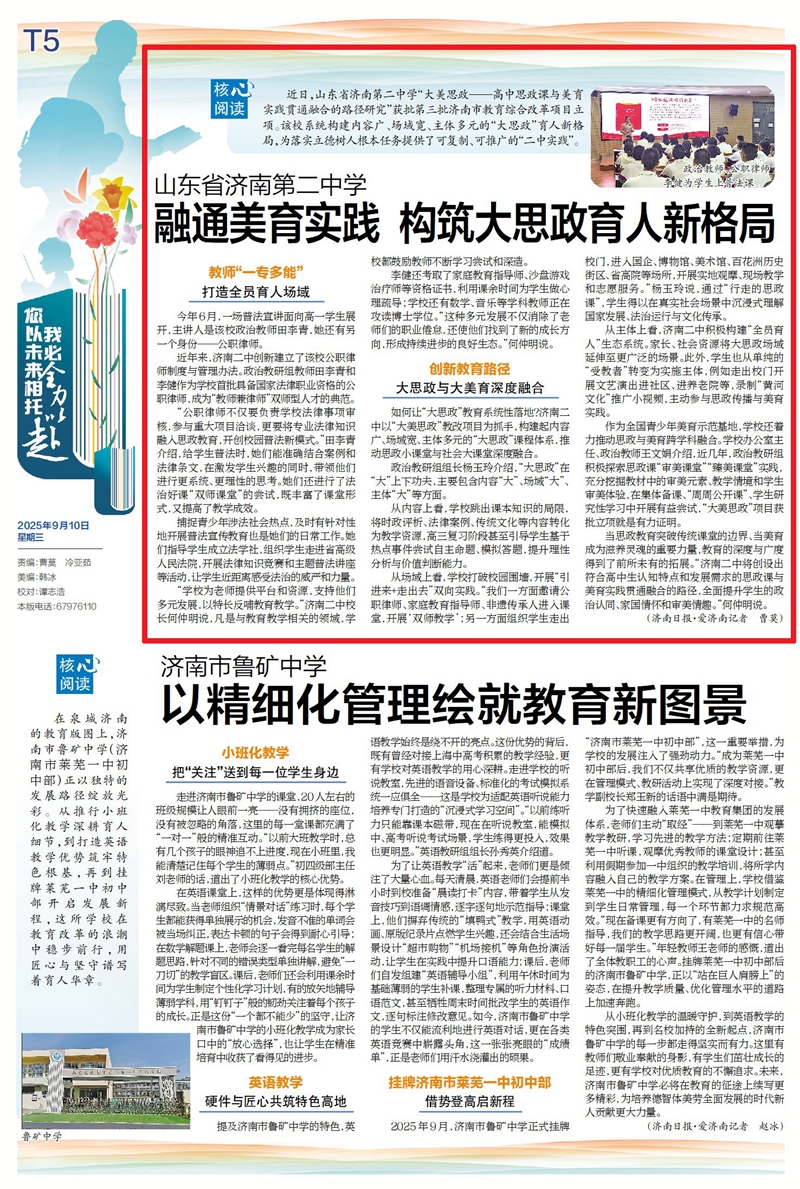 9月10日,《济南日报》教师节特刊刊文《山东省济南第二中学:融通美育实践 构筑大思政育人新格局》。