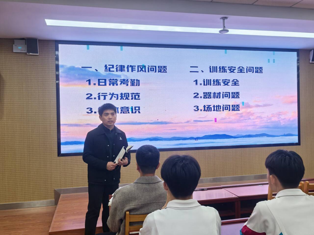 张元甲结合体育生日常训练、学习、生活实际,提出针对性具体要求。学习和训练方面,强调要坚持学训并重,全面发展,不能重训练而轻学习;健康方面,叮嘱学生注重饮食营养均衡,养成良好作息,保持良好身体状态;日常管理上,要求严格遵守校规校纪,严禁私自外出、晚归,严守考勤纪律;同时格外关注心理健康,引导大家合理调节训练与学业压力,掌握运动损伤应急处置方法,遇到问题第一时间向老师汇报。