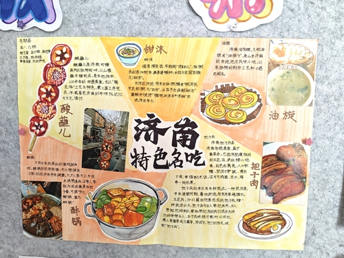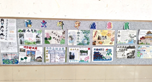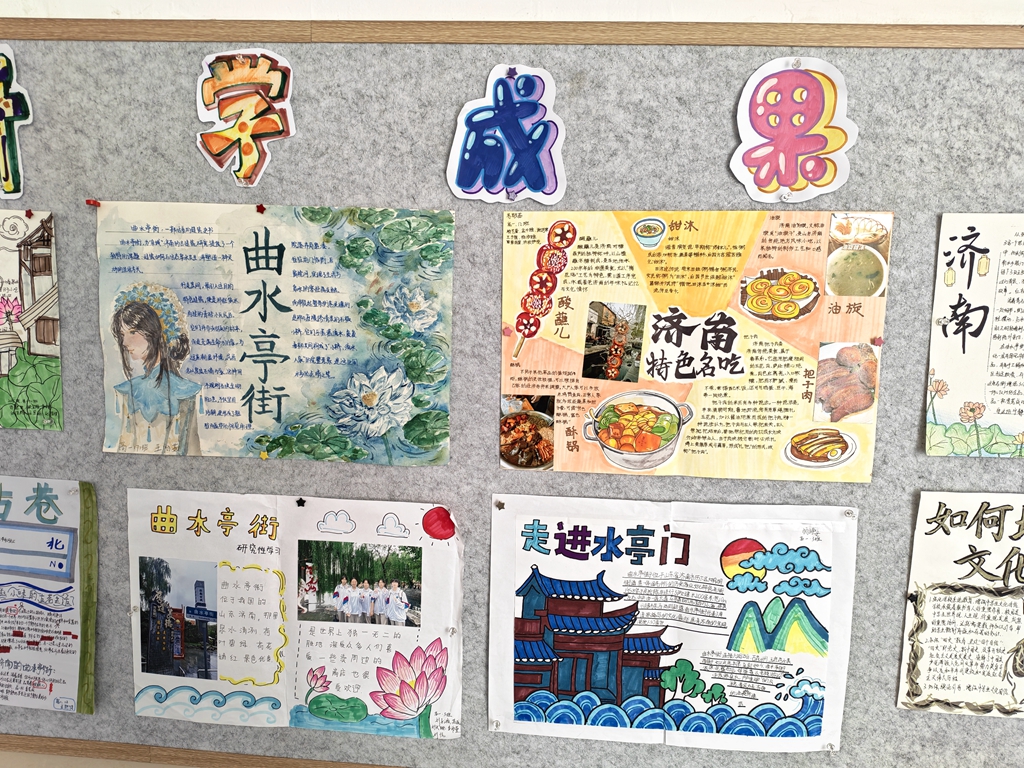 手抄报成果展览现场,曲水亭街的市井风情、超然楼的夜色流光、济南的特色小吃和济南皮影的精巧细节被一一呈现;手抄报里的调研片段,记录下对市民的访谈与泉水保护的思考;同学们用精准的文字释义、优美的画卷展示,将济南的人文底蕴与时代新貌娓娓道来,尽显扎实的语文核心素养。