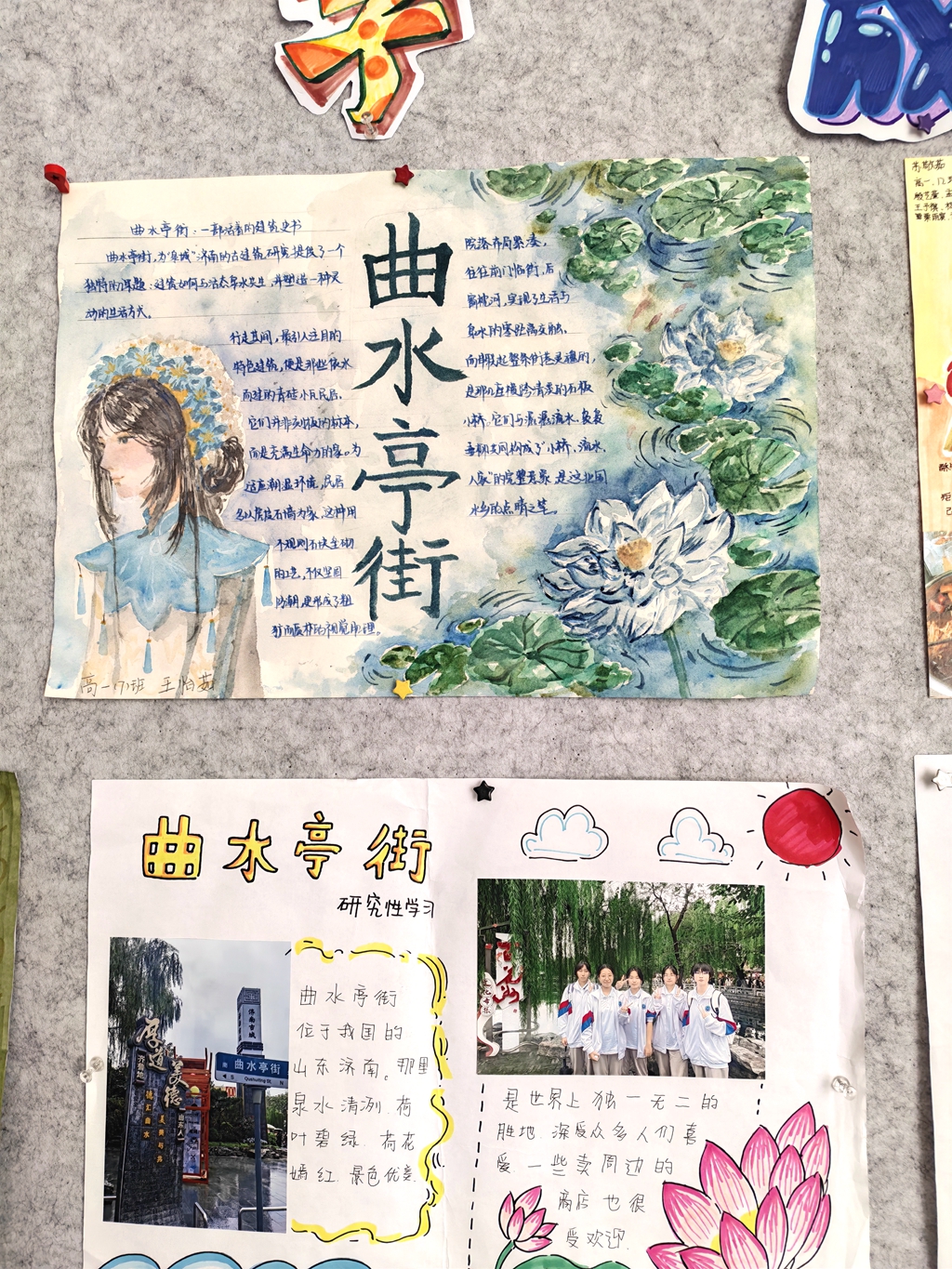 本次手抄报成果展紧扣高中语文必修课本“家乡文化生活”单元主题,自启动以来,高一语文组精心设计研学任务,引导学生先沉浸式阅读,然后走出课堂,深入泉城街巷。学生们分组围绕泉水文化、历史名人、老街巷肌理、非遗传承等九大主题开展调研,用阅读体验和脚步丈量济南文脉,以手抄报形式记录济南文化的温度。