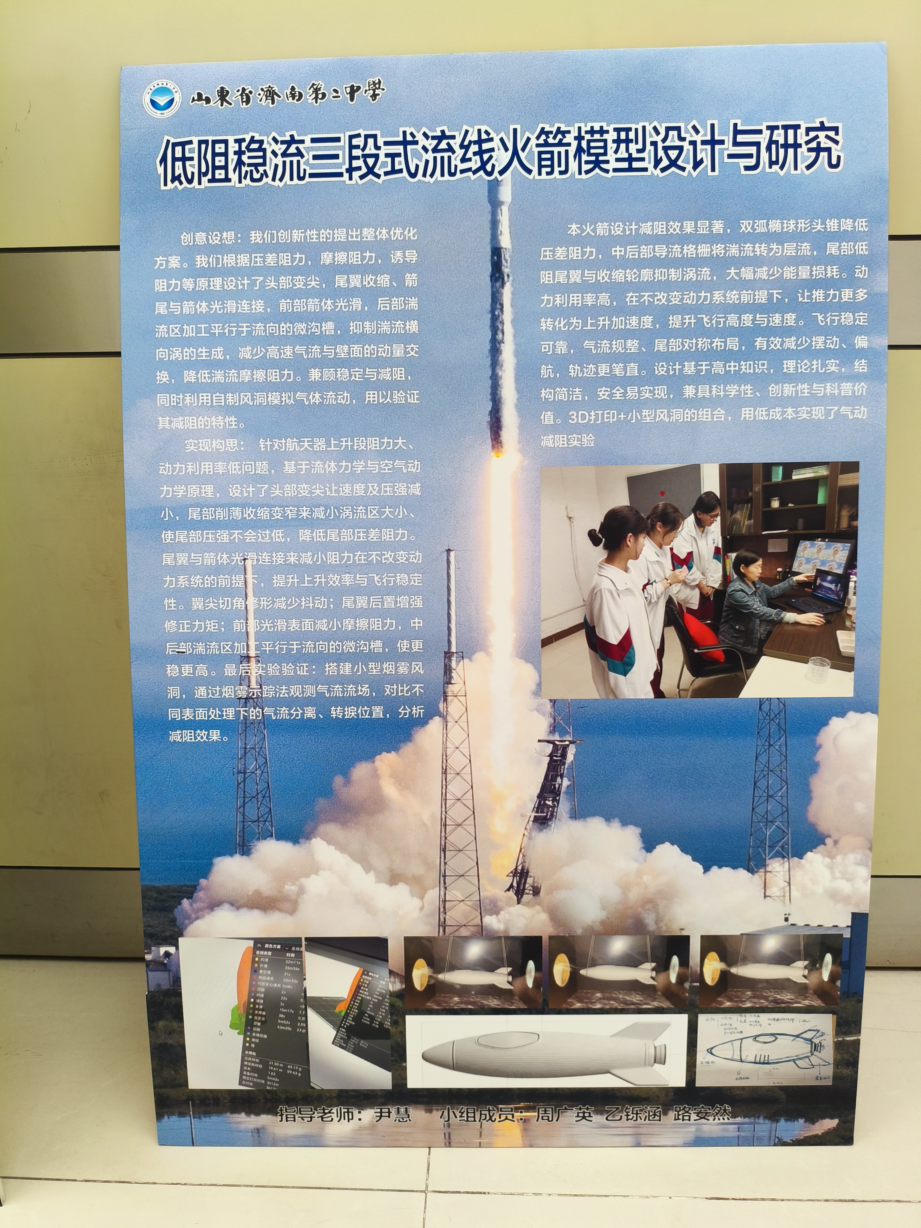 展厅首推的《低阻稳流三段式流线火箭模型设计与研究》项目,由高二学生团队自主完成。他们突破传统火箭外形限制,融合流体力学与空气动力学原理,设计出“流线型头部+尾部收缩鳍+中部导流槽”的三段式结构,显著降低飞行阻力,提升推进效率。项目负责人表示:“我们希望用科学优化每一寸气流,让火箭飞得更稳、更高、更远。”