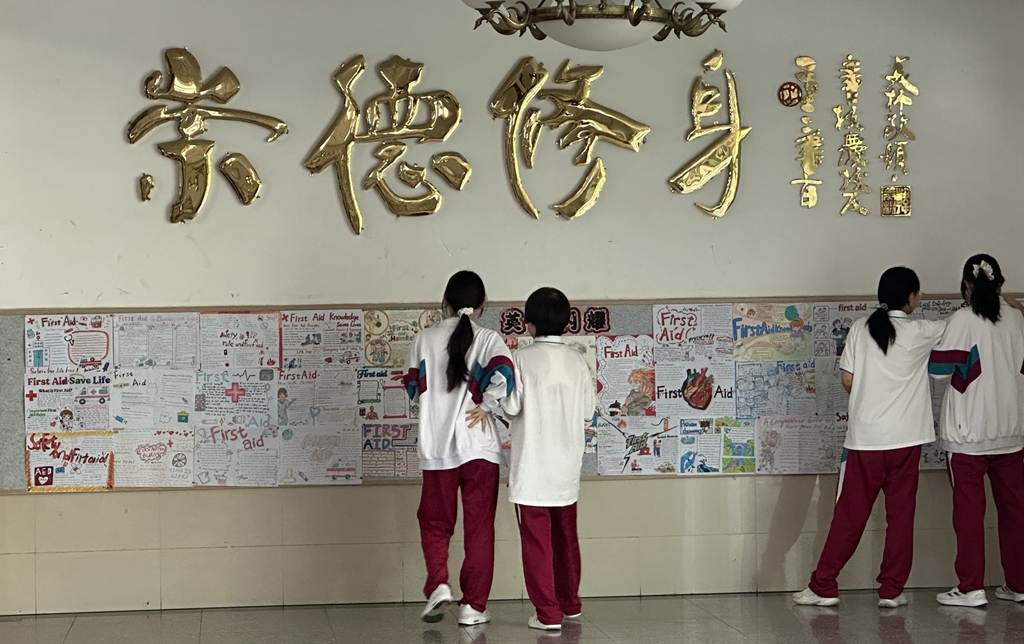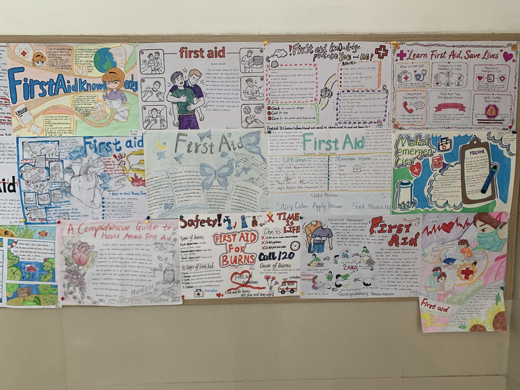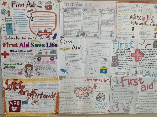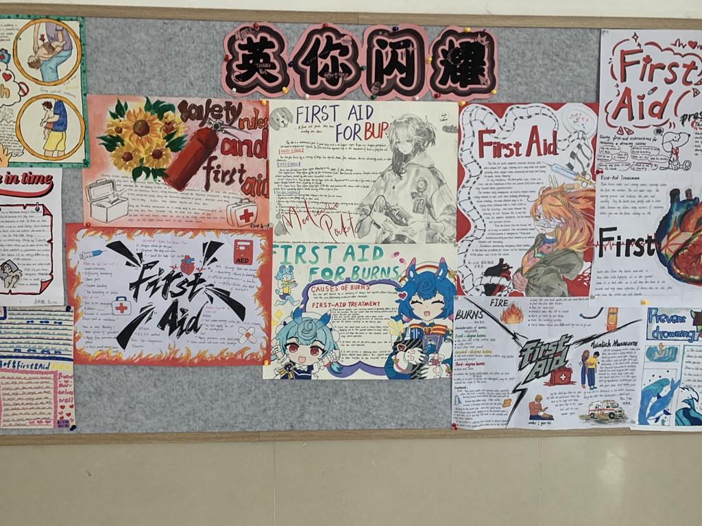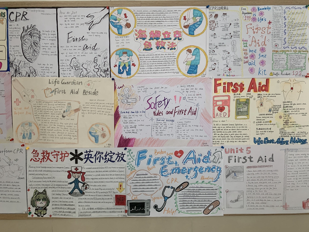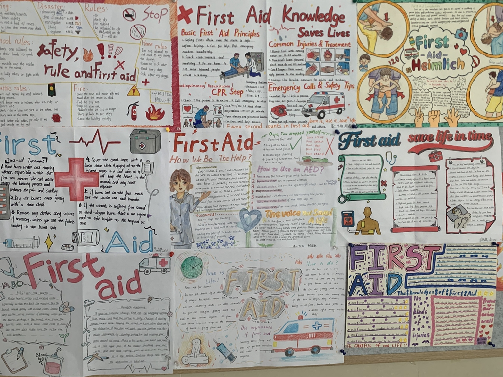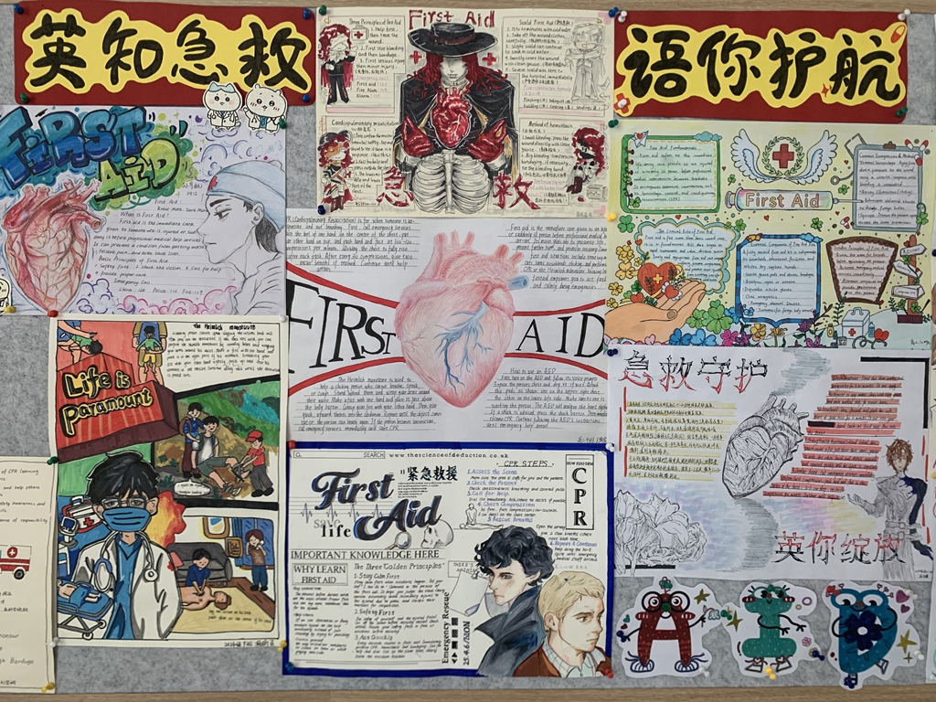 4月23日,继“英文短剧展演——海姆立克急救实操”跨学科实践活动成功举办后,为进一步延伸活动成效,深化英语学科与生命安全教育的融合育人价值,济南二中高二英语组精心策划的急救知识英文手抄报展已圆满完成评审,并于教学楼二楼大厅正式展出,成为校园里一道兼具知识性与艺术性的风景线。本次活动以急救知识为载体,以英语表达为桥梁,让学生在创作与展示中巩固语言知识、内化急救技能、提升综合素养,为跨学科融合教学写下了生动的续篇。