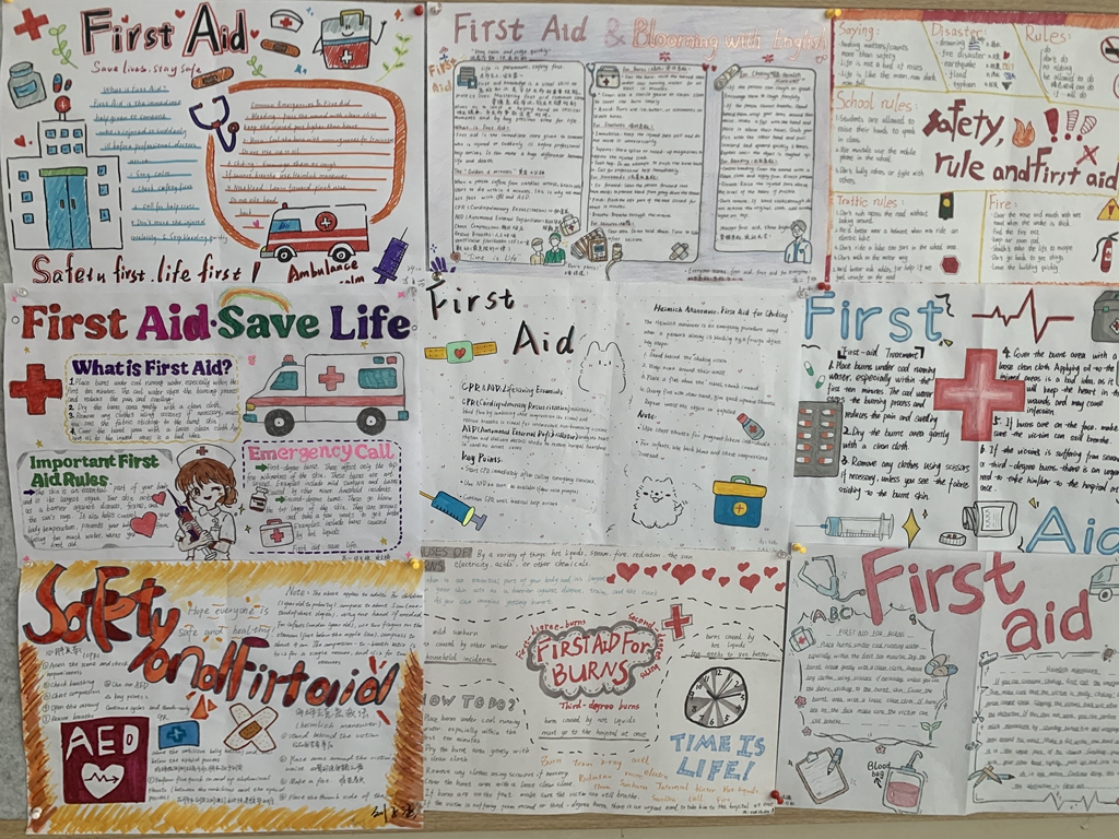 本次创作中,同学们热情高涨、积极参与,主动查阅资料、梳理急救步骤、打磨英文表达,将 first aid、CPR、Heimlich maneuver、choking、self-rescue 等急救核心词汇与句型巧妙融入作品,用图文并茂的形式呈现气道异物梗阻、心肺复苏、擦伤处理等急救场景。创作过程中,同学们不仅在自主探究中提升了信息整合能力与语言运用能力,更在梳理急救知识的过程中强化了生命安全意识;不少作品还融入了个性化创意设计,用色彩鲜明的插图、条理清晰的步骤图解,让专业的急救知识变得生动易懂,充分展现了二中学生扎实的英语素养、丰富的想象力与强烈的责任担当。