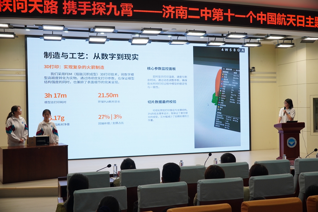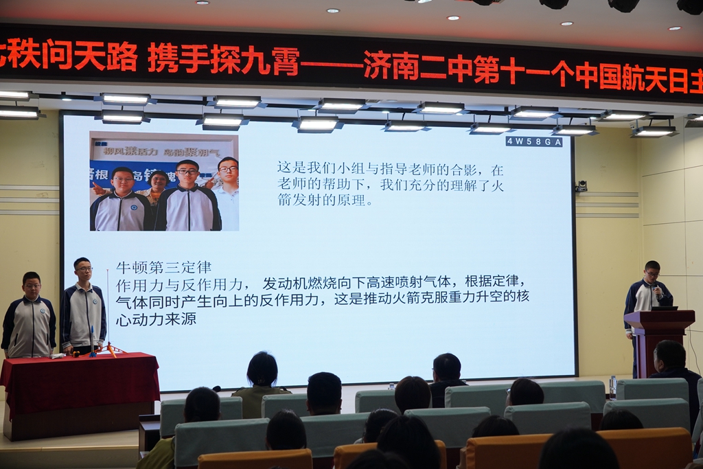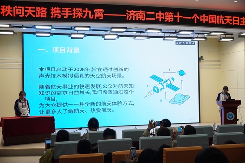 七秩问天路,携手探九霄。在第十一个中国航天日到来之际,一场以“航天赋能科学教育 创新培育素养人才”为主题的科创盛会于4月21日上午在济南二中综合楼B区学术报告厅隆重启幕。本次活动既是学校航天特色科学教育成果的集中展示,也是师生致敬中国航天事业70年辉煌成就的青春献礼。来自明湖中学、云锦中学、五柳岛中学三所贯通初中与济南二中高二年级的14支科创团队齐聚一堂,以青春之智叩响科学之门,以创新之笔书写航天梦想,共同谱写了一场贯通初高中、融合理论与实践的科创育人新篇章。