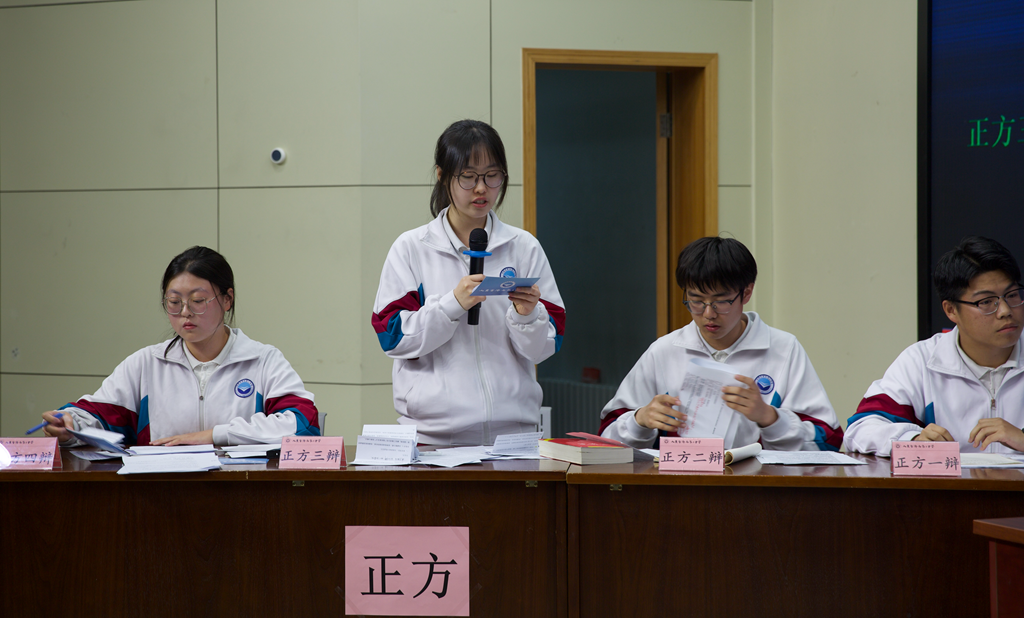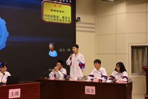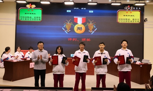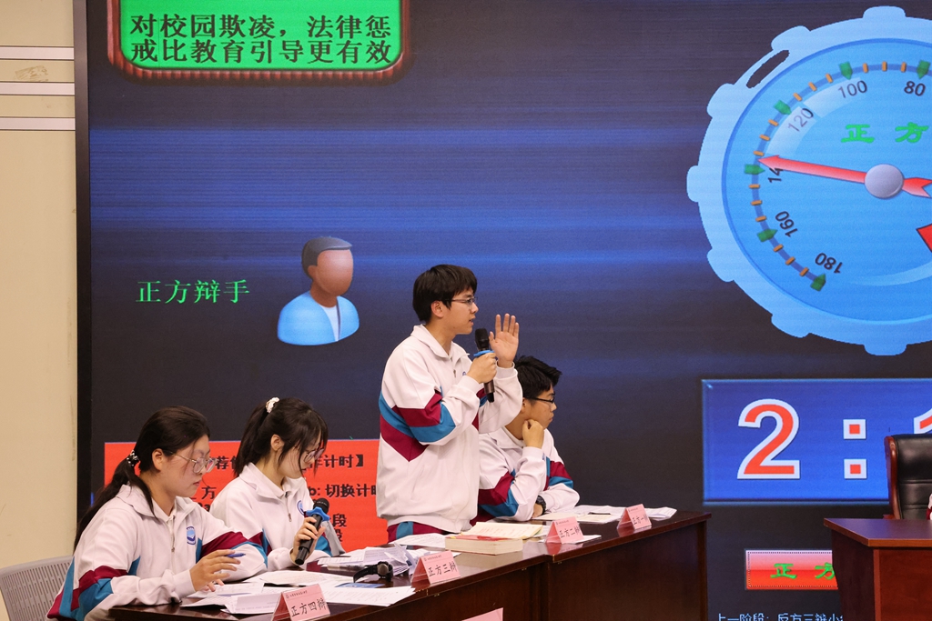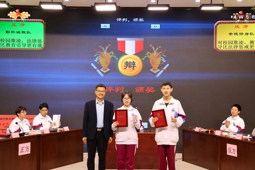 本次决赛邀请政治组田李青、李健两位公职律师,语文组宋薇、马媛媛老师及辩论队指导老师刁宁担任评委,党委书记贺涛、校长何仲明、政教处王磊主任出席活动,法学社、辩论社全体成员及各班级学生代表到场观赛。赛后,刁宁老师、何仲明校长先后点评,肯定了辩手们的精彩表现与思辨风采,同时引导学子辩证看待校园欺凌治理问题;观众点评环节,现场学子积极发言,交流观赛感悟。
