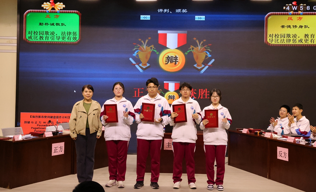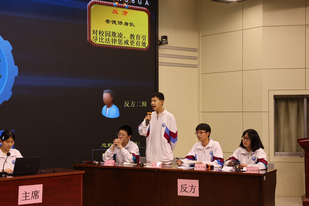 本次决赛辩题由学校法学社拟定,聚焦“校园欺凌治理中法律惩戒与教育引导的有效性”,正反双方展开巅峰对决。正方辩手耿铭涛、许文博、张若怡、薛瑞丰与反方辩手黄建国、李学瑞、张振轩、孙梦楠,凭借扎实的积累、敏捷的思维,在立论、驳论、自由辩论环节你来我往、针锋相对。他们引经据典、结合实际,既坚守自身立场,又精准捕捉对方逻辑漏洞,言辞犀利却不失理性,从容应对中尽显活跃的思辨能力与良好的表达素养,现场掌声不断。