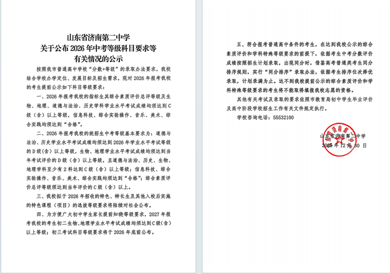山东省济南第二中学关于公布2026年中考等级科目要求等有关情况的公示20251230
