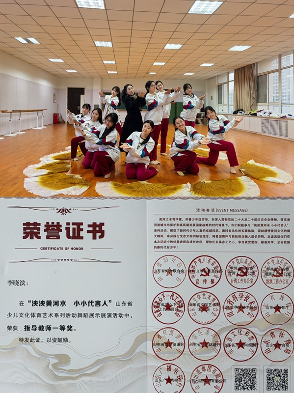 近日,由中共山东省委宣传部、中共山东省委台湾工作办公室、中共山东省委港澳工作办公室、山东省妇女联合会、山东省关心下一代工作委员会、山东省文学艺术界联合会、山东省科学技术协会、山东省教育厅等14家单位联合主办的“泱泱黄河水 小小代言人”舞蹈展示展演活动圆满落幕。本次赛事竞争激烈,全省9000余名学生同台竞技,经层层遴选我校“艺韵芳华”舞蹈团学子凭借原创红色题材舞蹈《二月棉花红》,成功斩获青少年B组(高中)一等奖,指导教师李晓滨获评省级“优秀指导教师奖”。