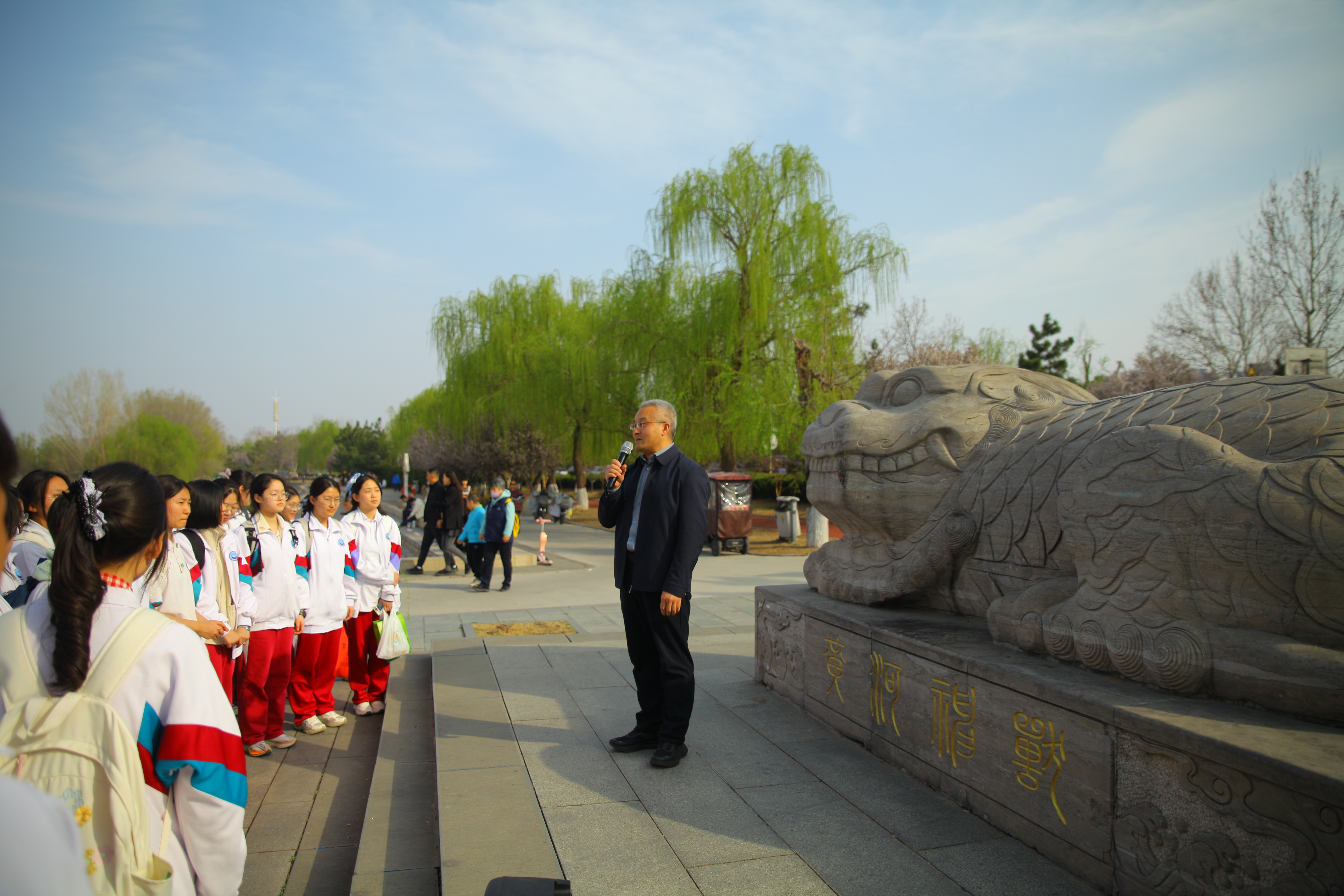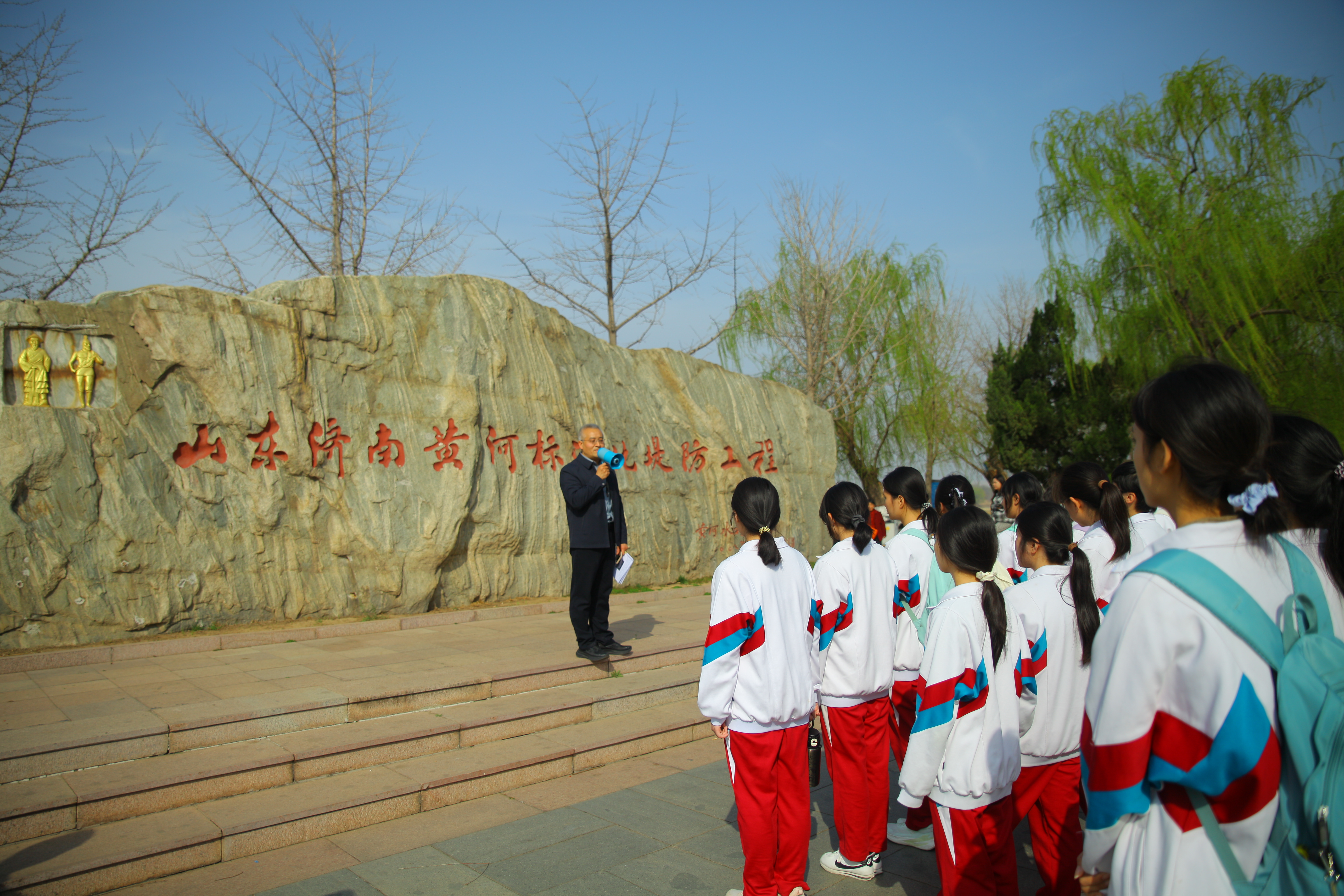 沿着黄河大堤,师生们先后参观了济南标准化堤防工程、毛主席视察黄河纪念广场、泺口险工、黄河神兽、治黄方略石刻群、黄河龙墙等研学点。在地理老师刘军、邢丽霞老师的专业解说下,同学们深入了解了标准化堤防的工程原理、泺口险工在黄河防洪中的战略地位,以及“黄河神兽”所承载的治水智慧。历史老师王博宇则结合毛主席视察黄河的历史背景,生动讲述了党领导人民治黄的辉煌历程,并在黄河龙墙前解读了黄河文化作为中华民族根与魂的深刻内涵。