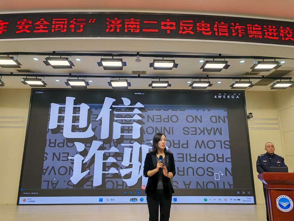 为切实增强在校学生的防骗意识和自我保护能力,筑牢校园安全防线,4月13日,济南二中开展了以“青春无诈,安全同行”为主题的反电信诈骗进校园活动。本次活动特邀济南市天桥区反诈中心教导员陈国华作专题讲座,学校德育副校长王莎莎参加并作总结讲话,活动由学校安全保卫部主任王朝晖主持。黄台派出所李直军警官也参加了活动,并与部分学生就电信诈骗、校园欺凌等问题进行了深入座谈。