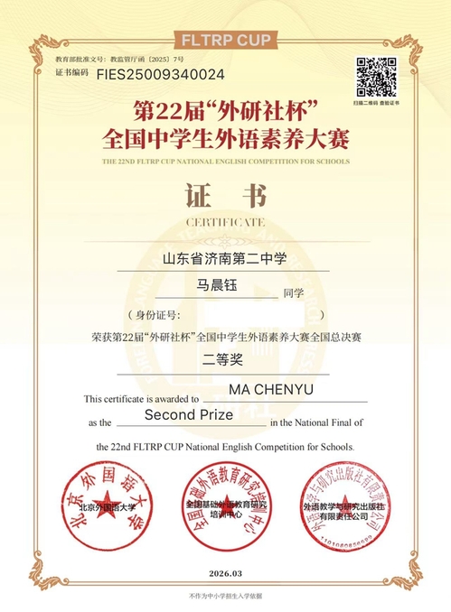 近日,第22届外研社全国中学生外语素养大赛全国总决赛圆满落幕,济南二中高二学子马晨钰凭借扎实的外语功底、出色的临场应变能力与深厚的综合素养,一路过关斩将,从全国众多优秀选手中脱颖而出,斩获国赛二等奖,为学校再添荣誉!