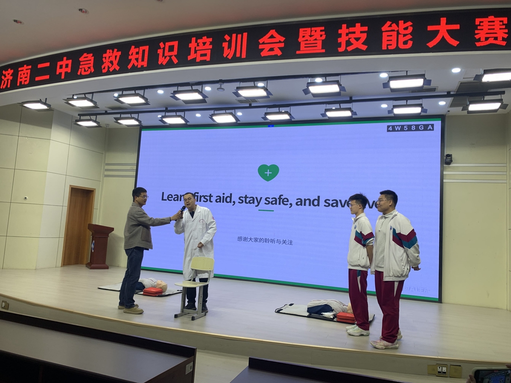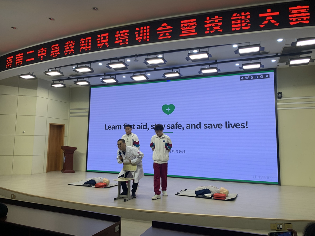 一直以来,济南二中英语组坚守素养导向、实践育人理念,积极探索语言教学与健康教育、美育教育、德育实践的融合新路径,以特色活动赋能学生全面发展。本次 “急救守护成长,英语点亮梦想” 主题实践,不仅充分展现了英语组教师的专业实力、协作精神与育人情怀,更彰显了二中学子自信大方、乐学善用、勇于实践的良好风貌,为校园安全建设与学科高质量发展注入了强劲动力。此次活动是济南二中高二英语组跨学科融合教学的创新实践,既帮助学生巩固了英语知识、提升了语言应用能力,又丰富了急救素养、强化了生命安全意识,更与学校美育特色深度契合,学生的审美情趣、表达能力与责任担当得到了全方位培养。未来,济南二中英语组将继续深耕跨学科融合教育,打造更多有温度、有内涵、有特色的育人活动,用英语点亮青春梦想,用急救守护健康成长,助力二中学子成长为兼具语言素养、安全意识与人文情怀的新时代青年!