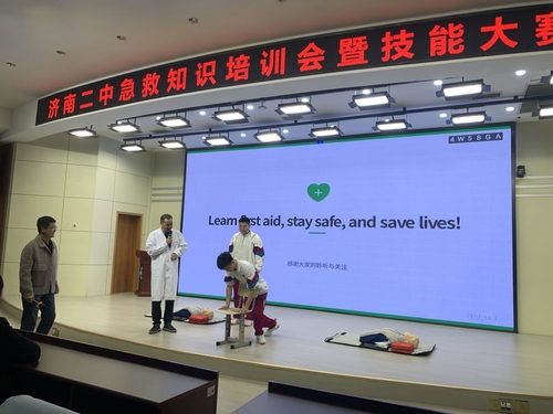为深入落实“健康第一”教育理念,深化医校协同育人机制,推动学科融合与生命安全教育落地生根,在学校心肺复苏培训与技能竞赛系列活动中,济南二中高二英语组紧扣选修二第 5 单元急救主题,以“急救守护成长,英语点亮梦想”为核心,创新开展“英文短剧展演——海姆立克急救实操”跨学科实践活动,将英语语言运用、急救技能学习与学校美育特色深度融合,以语言赋能实践、以急救守护成长,书写了学科融合育人的精彩篇章。