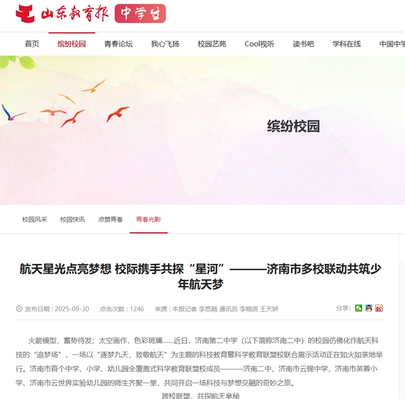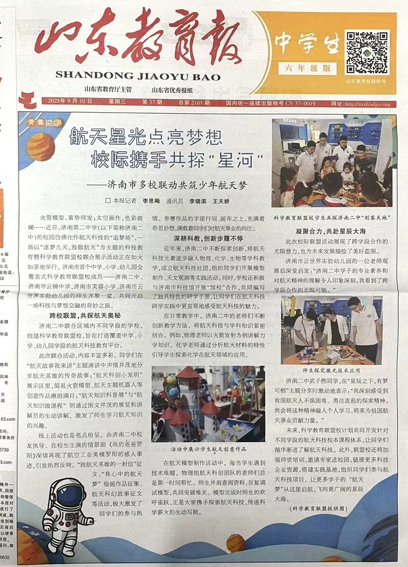 近日,《山东教育报》中学生版头版头条刊发山东省济南第二中学(以下简称济南二中)牵头的多校联动共筑航天梦活动。火箭模型的精妙制作、太空画作的斑斓色彩、师生共探航天科技的专注身影,无不展现出济南二中和联盟校师生“逐梦九天,致敬航天”的热忱,蕴含着师生对航天科技的深入探索,寄托着对航天梦想的执着追求和对科学精神的尊崇。