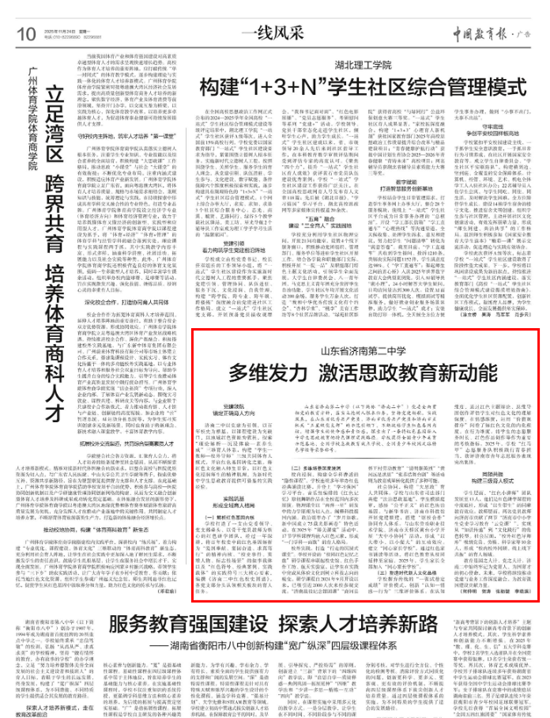 11月24日,《中国教育报》第10版“一线风采”刊发文章《山东省济南第二中学 多维发力 激活思政教育新动能》。全文如下: