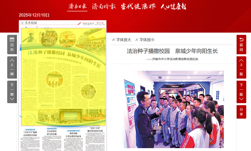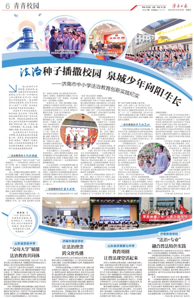 12月10日,济南日报“青青校园”栏目刊发文章《法治种子播撒校园 泉城少年向阳生长——济南市中小学法治教育创新实践纪实》。文章在“法治教育的系统性构建”模块中,济南二中思政教师、公职律师李健接受记者采访。李健告诉记者,“双重身份”也是她精进自我的方式之一。除了自身的努力,市教育局与学校构建的新课标培训、名师送教、网络研讨等多元化的平台都在为老师们赋能。“我们在不断探索创新教学方式,无论是带领学生开展实践活动,还是组织主题研讨,每一种尝试都是想让法治精神能真正入脑入心。”(来源/文化宣传中心 初审/供稿 李泽薇 复审/袁伟 终审/贺涛 编辑/核发 袁伟)